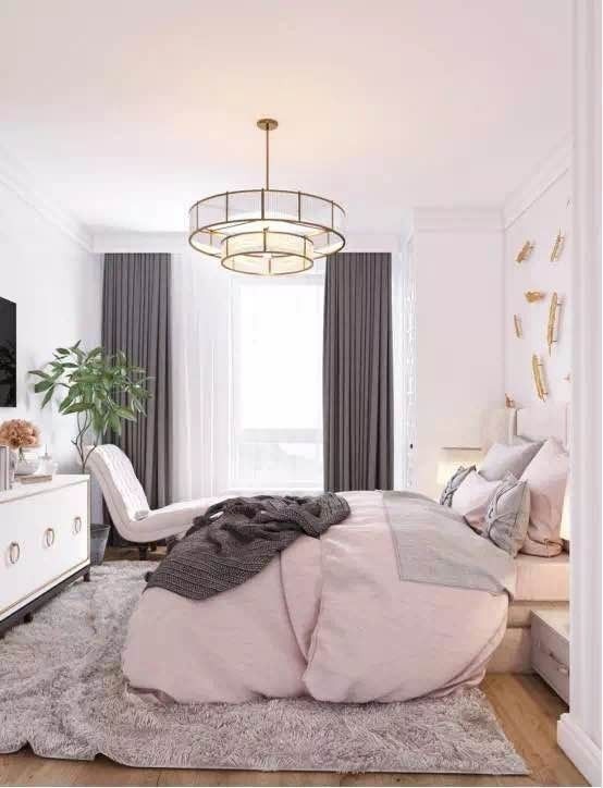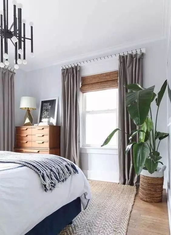 卧室的窗帘更注重功能性,要充分避光以保证睡眠。卧室内窗帘最好选择落地款,以免窗帘过短而漏光。