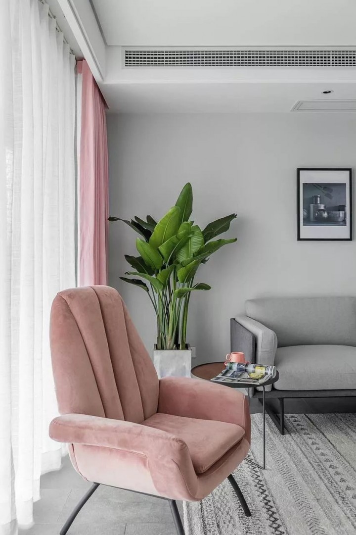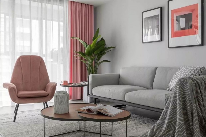 窗帘的粉红既不花哨又不会单调无趣,且与灰色沙发、木纹茶几融成一个十分和谐的视觉整体。