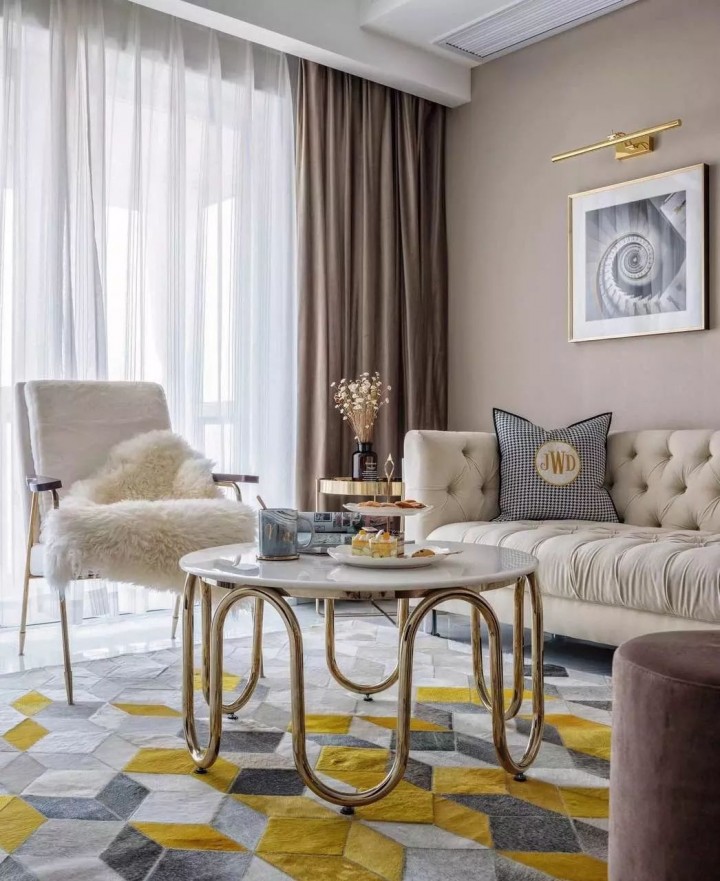 用窗帘呼应地毯、沙发等其它软质家装的色感,是简单又保险的做法