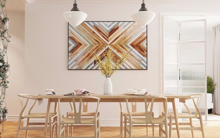 一般来说,人们会选择各种巨幅抽象画、色彩鲜艳的几何图形,或者简洁利落的线条勾勒做装点,再搭配原木桌椅和艺术灯饰,将充满情调的用餐氛围推向极致。