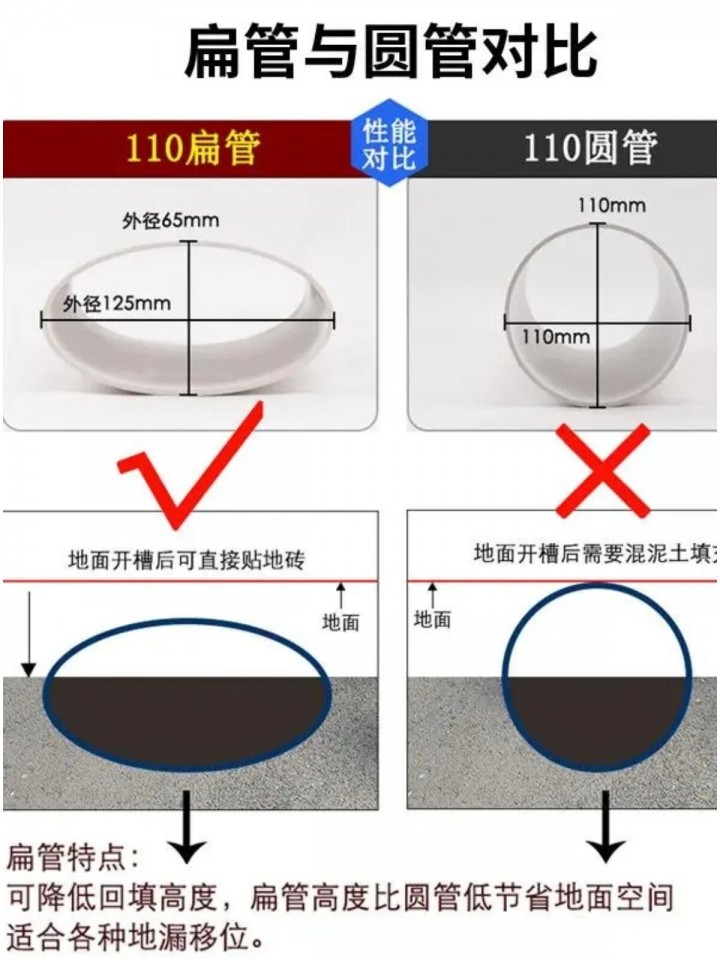 能用110圆管绝不用110扁管。大多是由于贴砖高度受限必须用110的扁管,110扁管相较于110圆管,整体厚度只有60-70mm之间,加上地面开几厘米槽,不会增加卫生间贴砖高度,所以110扁管常用于马桶移位使用。