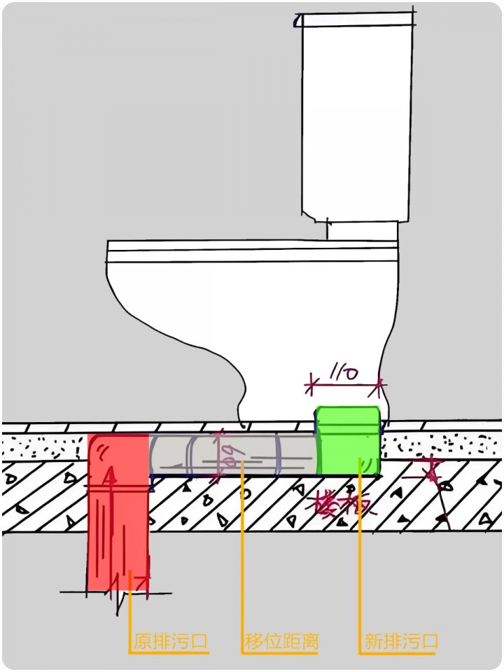短距离马桶移位可以购买成品移位器,超过20cm可能就需要水电工现场裁切扁管,调整下水坡度。