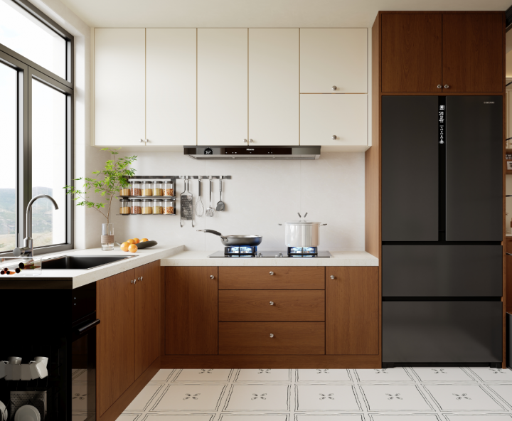 要做转角错层:传统的直角转角柜是收纳死角。采用错层设计或联动拉篮,能完美利用这个尴尬空间,让深处的锅具轻松现身,清扫也无死角。
