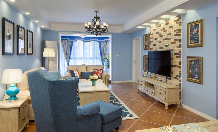 蓝色天空欧式风格80平米二居室客厅电视背景墙装修效果图